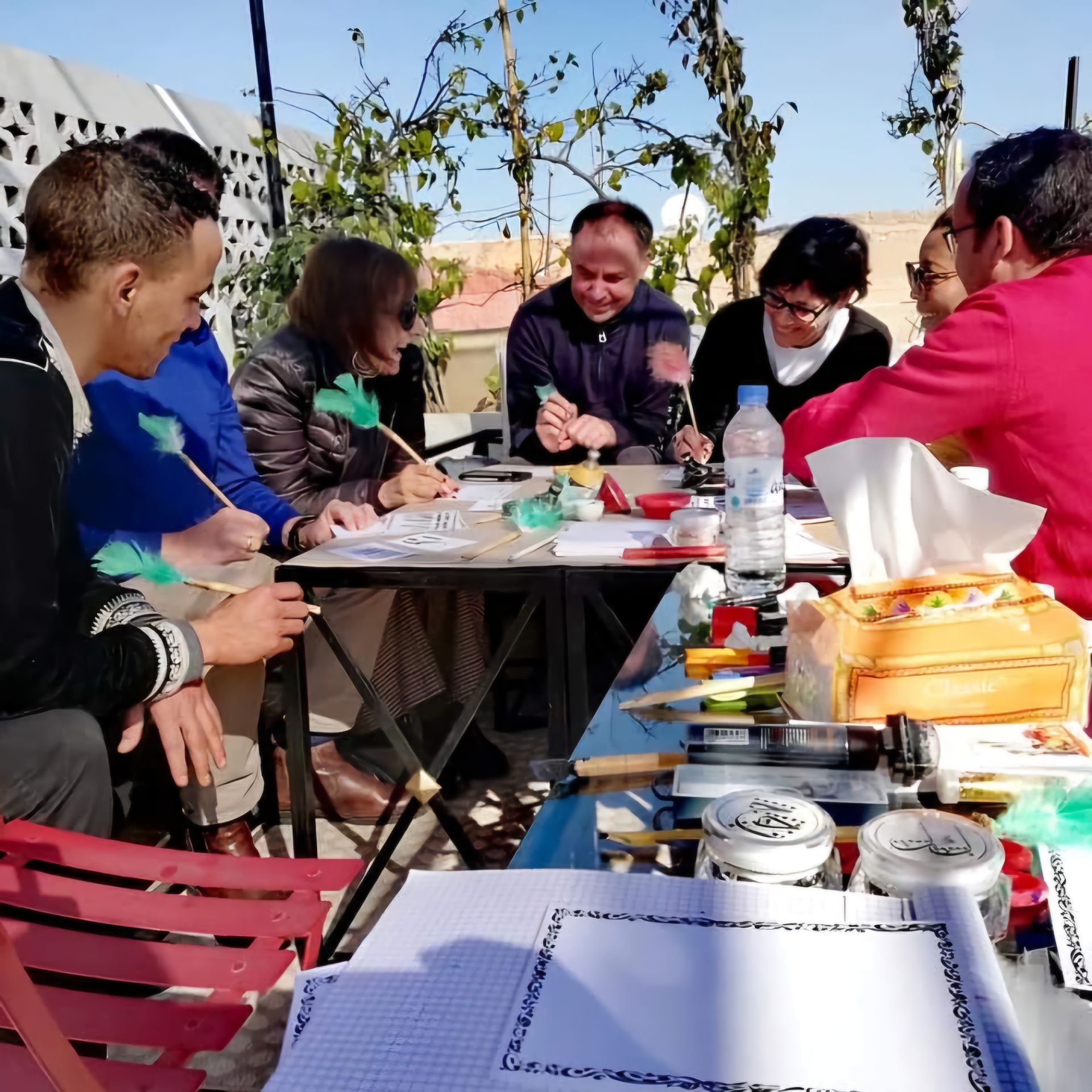 ✨ Un grand merci à Mme Constance et à son groupe pour avoir partagé avec nous un beau moment d’art et de culture au Riad Algora à l’occasion de notre atelier de calligraphie arabe. Toutes nos félicitations aux nouveaux mariés Cécile & Jean 💍🎉 #calligraphiearabe #ateliercalligraphie #événement #Marrakech #ArtEtCulture #arcallima #arabic_calligraphy_marrakech #calligraphyMarrakech #workshopmarrakechButton